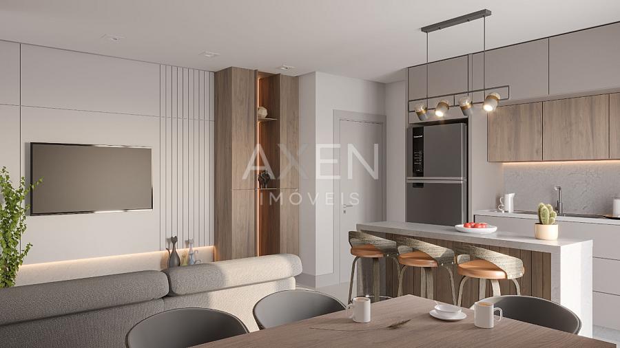 Living integrado com sala de estar, jantar e cozinha
