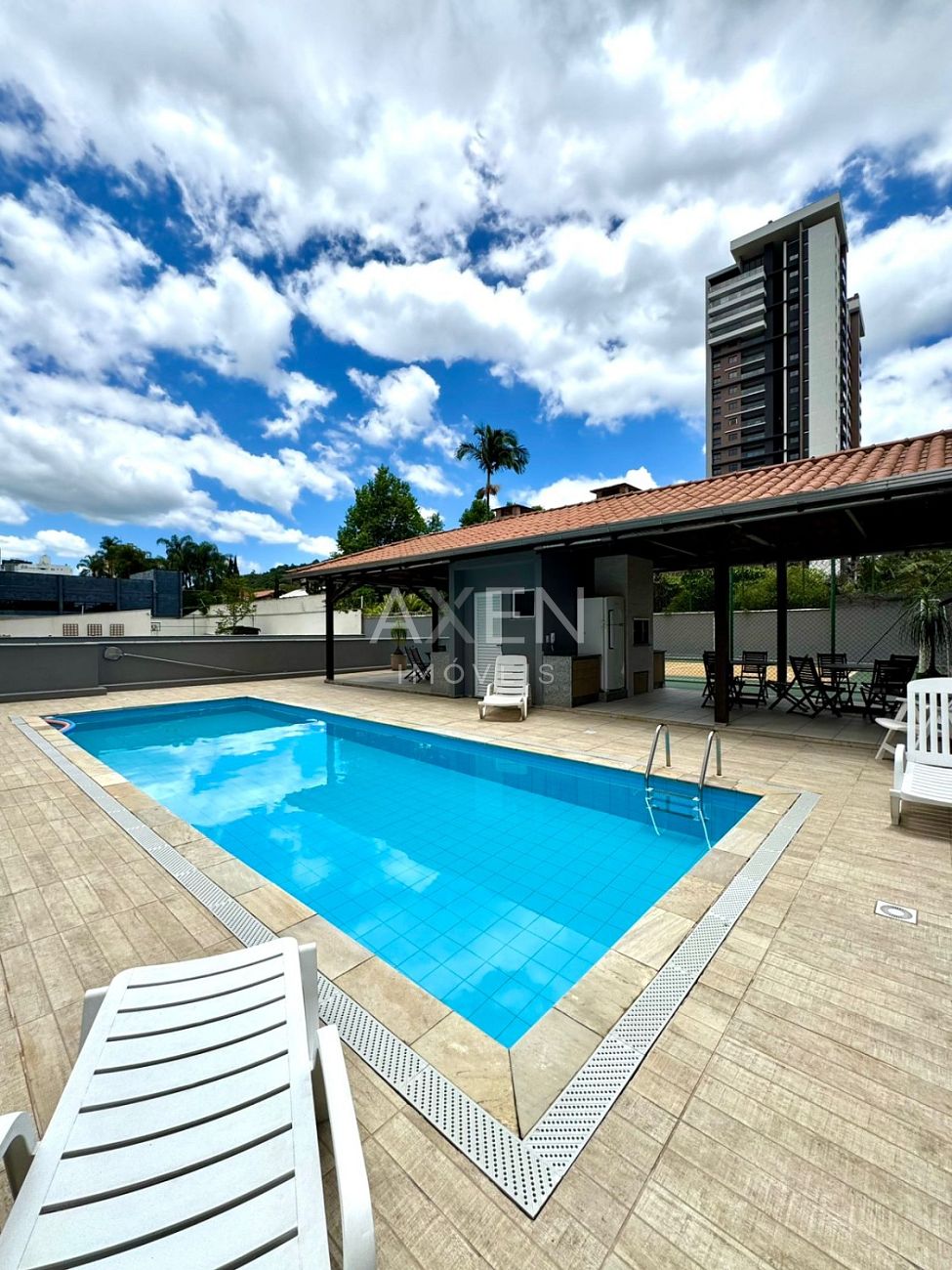 Piscina, quadra esportiva e salão de festas.